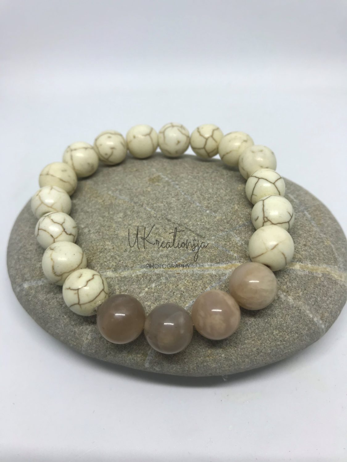 Beautiful gemstone stretch bracelet! Made with White Turquoise and Sun Stone Gemstones. Handmade in Jamaica. Fits Wrist size 7-9.